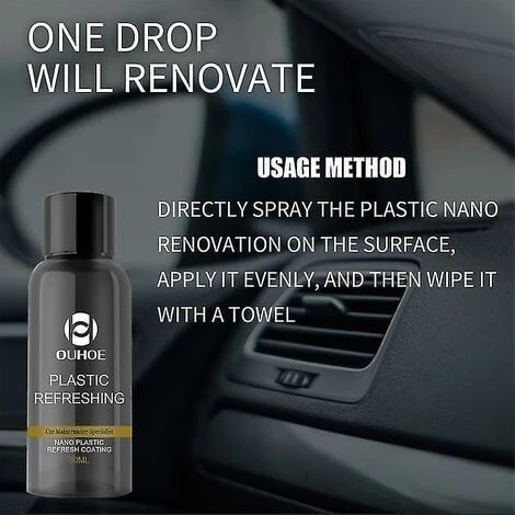 Description: Product name: automotive plastic retreading agent Product capacity: 30ml50ml Product size: 2.9*8.4cm3.3*9cm Product composition: silica resin Product gross weight: 36g 42g 56g 62g Product color: black Specifications: The lotus leaf principle is hydrophobic and penetrates to form a protective layer to avoid high temperature aging caused by sunlight.One drop can be refurbished simple to use directly spray the surface of the plastic nano refurbishment apply evenly and then wipe. Repair multiple interiors Sun protection Waterproof and dustproof retrofit to brighten Block ultraviolet rays and delay aging Package Included: 1*refurbishment agent or 1*refurbishment kit