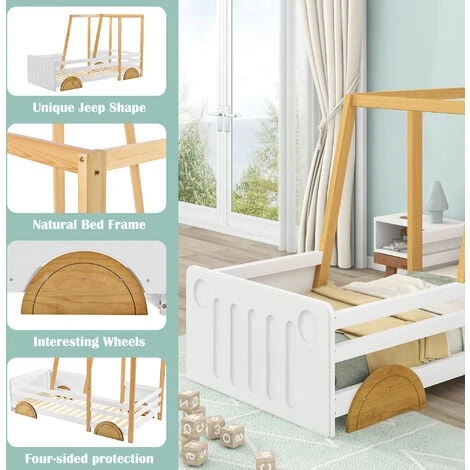 The bed’s unique headboard, wheels and top frame create a fun jeep shape. It fulfills the child’s desire to use a toy car as a bed and makes them sleep better, like driving a jeep in a dream.
