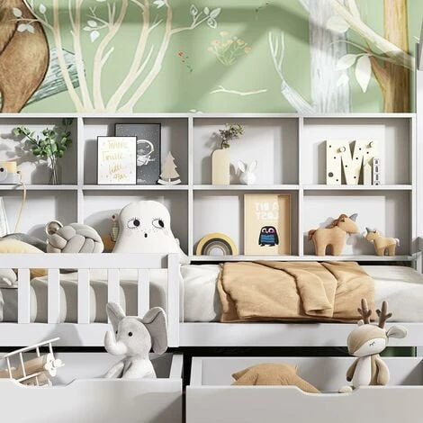Multifunction This Scandinavian-style cabinet combines storage and bed functions. The house shape of this toddler bed has a storage area on the back for books, toys and small items. This cot also has two large drawers to store unused items under the bed. The functional design of this product is thoughtful and very practical.