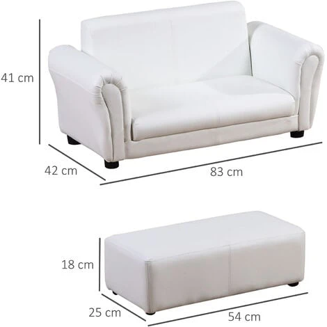 • Net Weight: 9kg • Sofa Weight Capacity: 60kg • Footstool Weight Capacity: 40kg • Sofa Dimension: 83L x 42W x 41H cm • Stool Dimension: 54L x 25W x 18H cm • Seat Size: 29W x 56D cm • Seat Height: 18cm • Suitable Age: 3-5 years old • Certification: BS5852 • Custom Label: 310-006WT