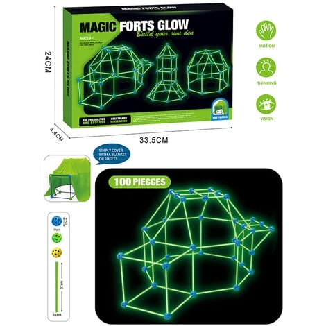 GLOW IN THE DARK FORT BUILDING KIT – Build endless play tent structures, forts, play tunnels and more with this fort building set that includes 64 glow in the dark connecting rods, 36 multilink spheresBUILD YOUR OWN FORT – Create giant kid’s forts by inserting and twisting the rods into the spheres (adult supervision is advised); Children can play indoors and outdoors. The glow-in-the-dark feature needs to be exposed to light before it activates in the dark. LEARNING TOYS FOR KIDS – Build and imagine while mastering basic engineering skills; this construction fort construction kit designed to spark creativity; make a children’s play tent by adding a light sheet for the roof. INSPIRE KIDS ABILITY – Ideal for cultivating children’s imagination, developing hand-eye coordination, training fine motor skills as well as improving color and shape recognition. the kids playset is made with BPA-free, child-safe plastic; includes 12.2 inch rods and 1.38 inch balls; These construction fort construction toys are perfect for curious-minded kids ages 4 and up. different displays may cause the color of the item in the picture a little different from the real thing. The measurement allowed error is +/- 1-3cm.