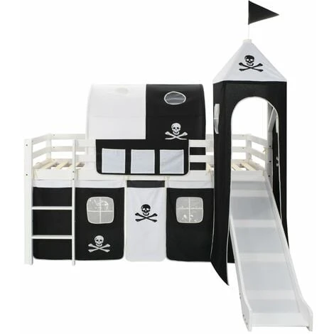 This pirate-themed children’s loft bed will be a real eye-catcher in your kid’s bedroom. The wooden loft bed has a solid construction and is delivered with the bed slats, a slide, a ladder, and a pirate-themed tent, side covers and a canopy. Guard rails on both bed edges will keep your little pirate in his or her bunk. The space underneath the bed transforms into the captain’s headquarters with the included sidewalls with windows. Additionally, the loft bed is distinguished by an entertaining slide and a ladder, both of which can be covered with the included tent. The slide and the ladder can be assembled either on the left or right, and a canopy for covering the bed is also included. The bed is suitable for 90 x 200 cm mattress. Your little one will love sleeping and playing in his or her very own pirate fortress! Please note that the mattress is not included in the delivery.