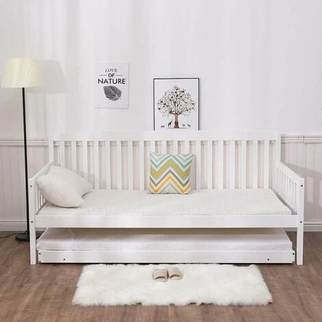 Pine wood white finish bed with under bed trundle A pull out underbed trundle which can be raised to the same level as the daybedÂ