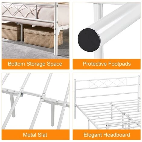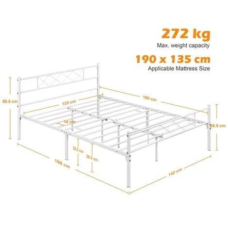 The head and foot end respectively showcases a row of x-shaped iron bars, which defines the aesthetic taste of the bed frame. Crafted of metal slats, side rails & center rails and support legs, our metal bed frame is sturdy enough for a good night’s sleep without the need for a bulky box spring. A well-painted surface resists scratch and oxidation and is easy to maintain. With 32.5cm of clearance under the bed, there is plenty of space for storage boxes and baskets. Plus, the headboard offers a perfect place for you to lean back and relax by plumping up your pillows. Ideal for bedrooms, guest rooms, dormitories, apartments and more.